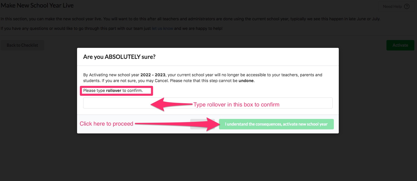 In this section, you can make the new school year live. You will want to do this after all teachers and administrators are done using the current school year, typically we see this happen in late June or July. Please note:
