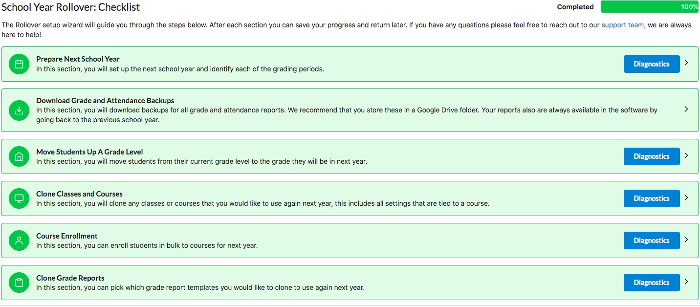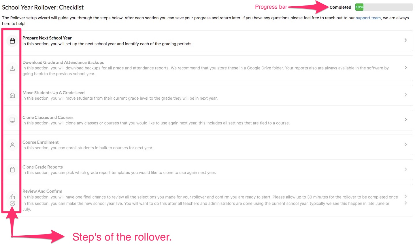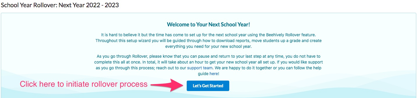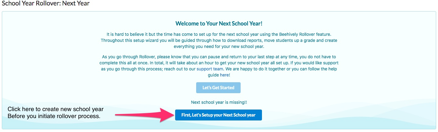 Start by clicking on “First, let’s setup your next school year”. If school year is already setup for you by support, then you should be able to click "Let's get started" and start rollover process.
