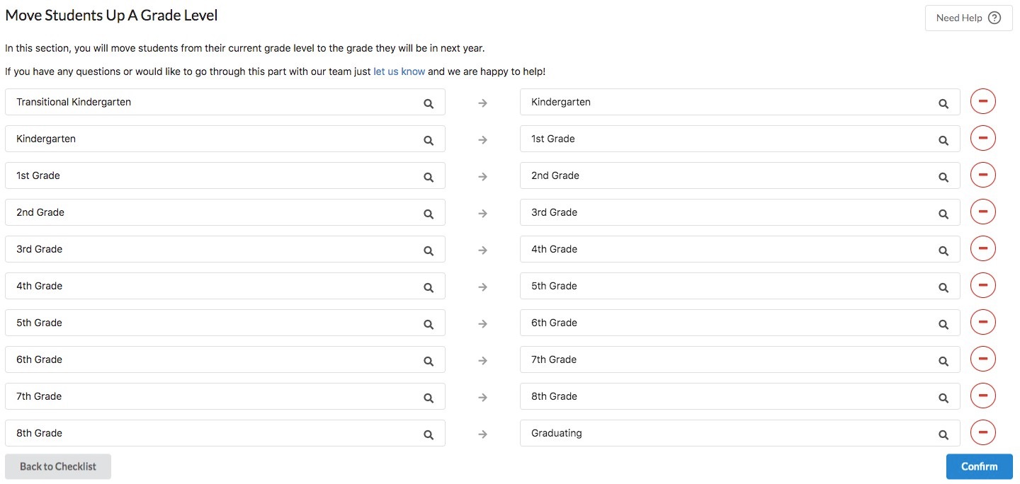For example in the screenshot below, 1st Grade will be moving to 2nd Grade.