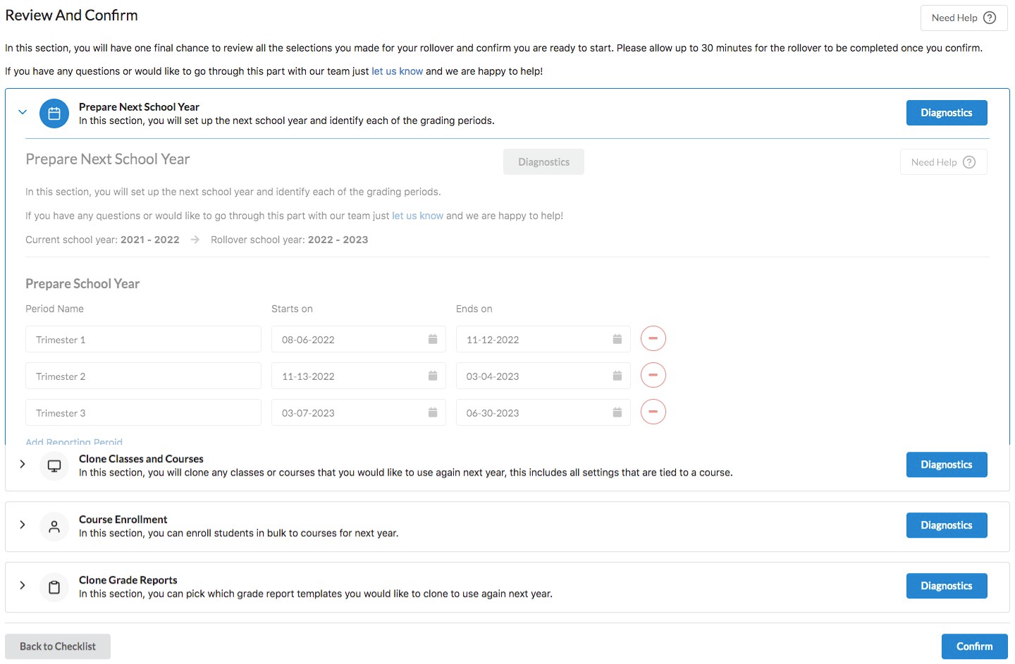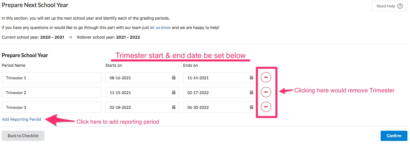 Once you are done setting up the academic periods, click “confirm” on bottom right to save the set up.