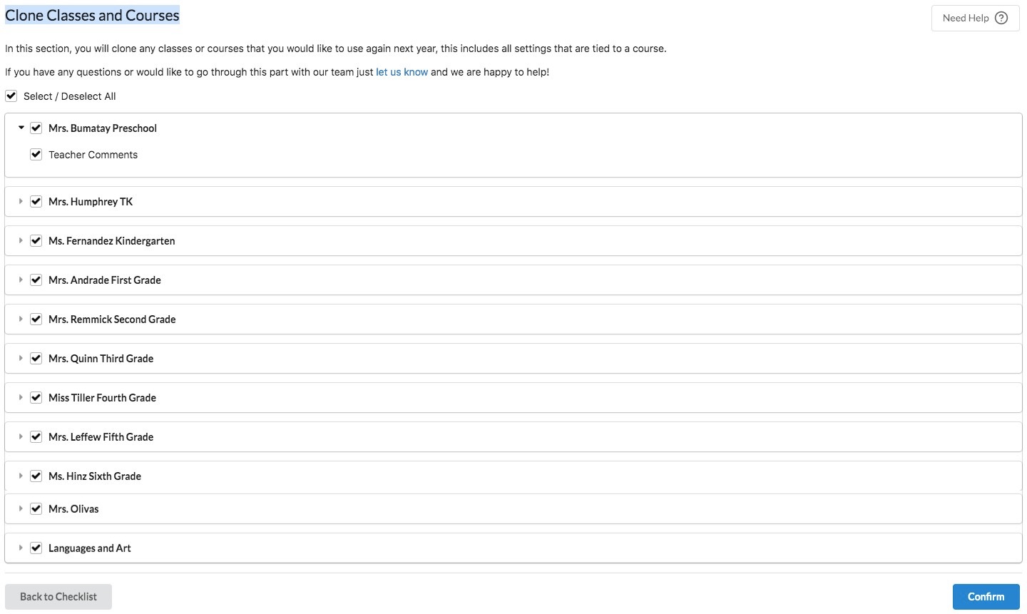 In this section, you will clone any class or courses that you would like to use again in the next school year. This includes all settings that are tied to a course.